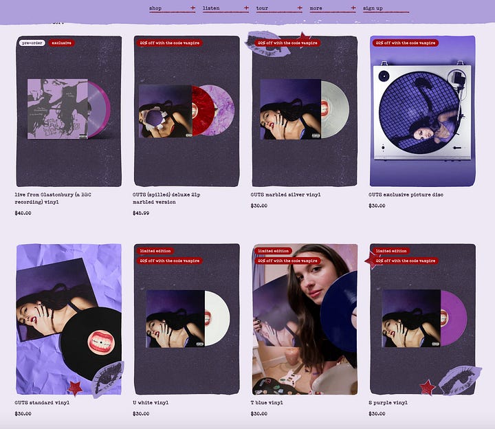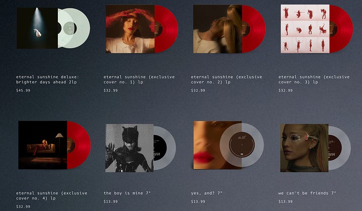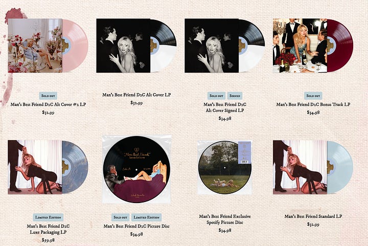 From Olivia Rodrigo and Sabrina Carpenter to Billie Eilish7 and Ariana Grande, it’s clear the multiple variant model has become an industry standard. Yet, Taylor Swift is presumably the most criticized for it. When we consider her decades-spanning fixture in the zeitgeist and rapid album cycles, this scrutiny is not entirely unfounded; she is a convenient example for many to pinpoint. What may further distinguish her from her peers is that Swift and her team regularly impose time constraints on purchasing select digital and physical versions of her albums.