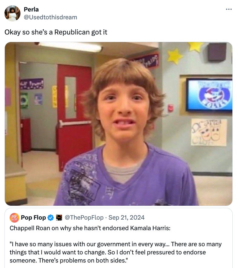 To be clear, Roan is justified in calling out the Biden administration’s complicity in the Israeli military occupation of Palestine. Our skepticism towards celebrities should extend to politicians, even if the politician in question appears to be the best possible candidate. Still, if she had initially clarified4 whether Democrats and Republicans are equivocally bad and specified the issues on “both sides” in the interview,5 perhaps fewer people would have misconstrued her statements.