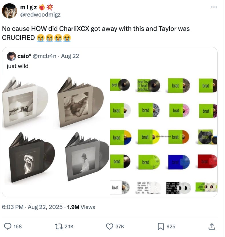 Charli xcx has released more vinyl variants for BRAT than Swift has for THE TORTURED POETS DEPARTMENT, but this tweet conveniently ignores how most of the criticism towards Swift also applies to her multitude of digital variants, not just the physical ones.