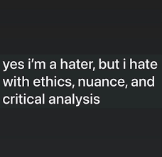 Numerous memes and social media posts reclaim the “hater” label, providing an unprecedented, positive connotation to a standard insult. Not only that — the term is frequently used in conjunction with “critical analysis.”