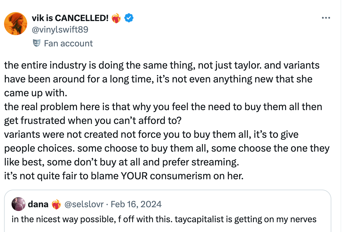 The underlying premise of the post is that if Charli xcx is releasing more physical variants than Swift, then it must be okay for Swift to do so. By shifting hostility from one artist to another, this post fails to dissect why variants are a problem in the first place. The priority is to extinguish the flames surrounding Swift, and the ethical question of multiple variants remains unanswered.