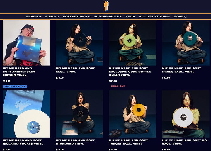 Billie Eilish has released multiple variants of HIT ME HARD AND SOFT, but unlike the other artists mentioned, her records are made from recycled materials.