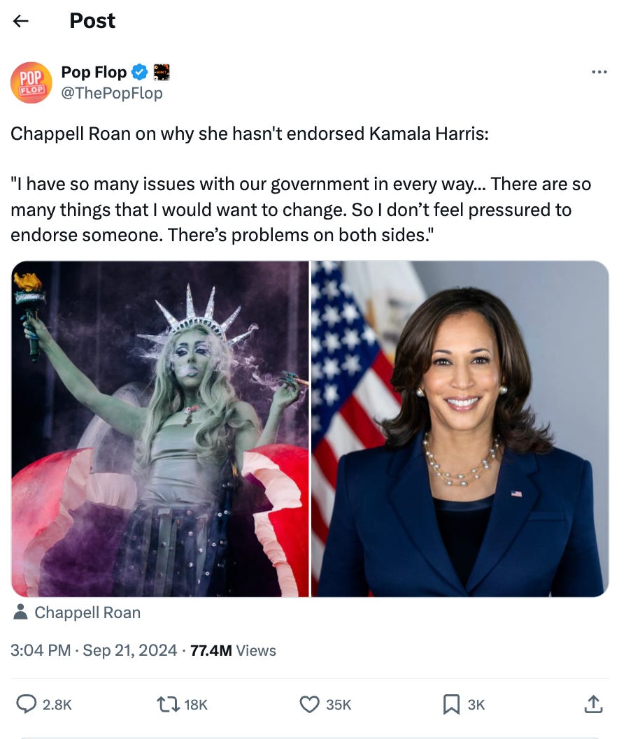 On September 21, 2024, the Pop Flop account on X tweeted an excerpt from this quote; the post has amassed over 77 million views and 35K likes. It did not include Roan’s call for her audience to think critically and vote in local elections, nor did it provide a link to the original article.
