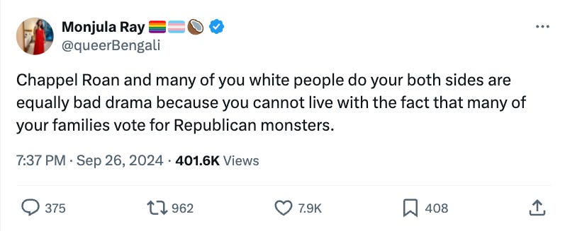 Despite the omitted context, those who are more familiar with Roan’s support for Palestine interpret her unwillingness to endorse Harris as a response to the Biden administration’s involvement in the destruction of Gaza.3