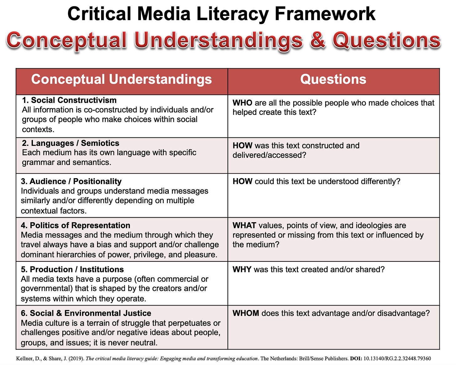 The first three understandings (“Social Constructivism,” “Languages/Semiotics,” and “Audience/Positionality”) speak to the translation of conventional literacy to other forms of media. They help us identify all possible creators of media texts, decode the use of language and symbols, and consider the different ways in which media can be interpreted.